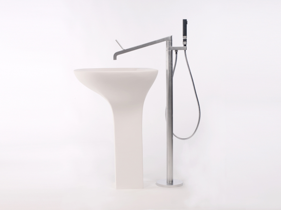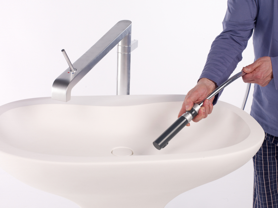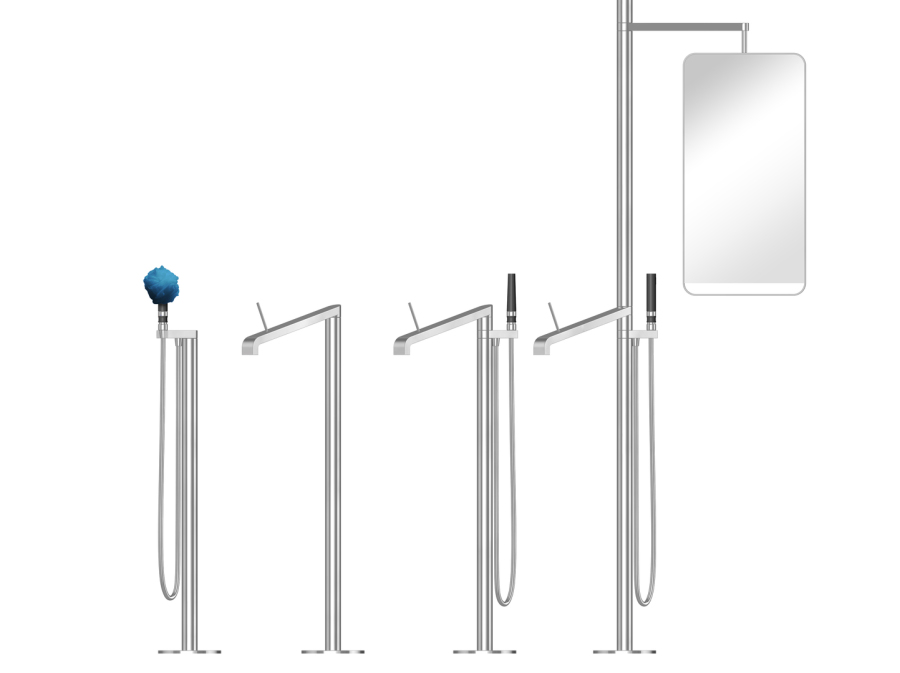 Eine Säulenvariante ohne Spiegel ist auch vorgesehen. Ein Extraschlauch mit Wechselaufsätzen an der Armatursäule geht auf unterschiedliche Bedürfnisse ein.