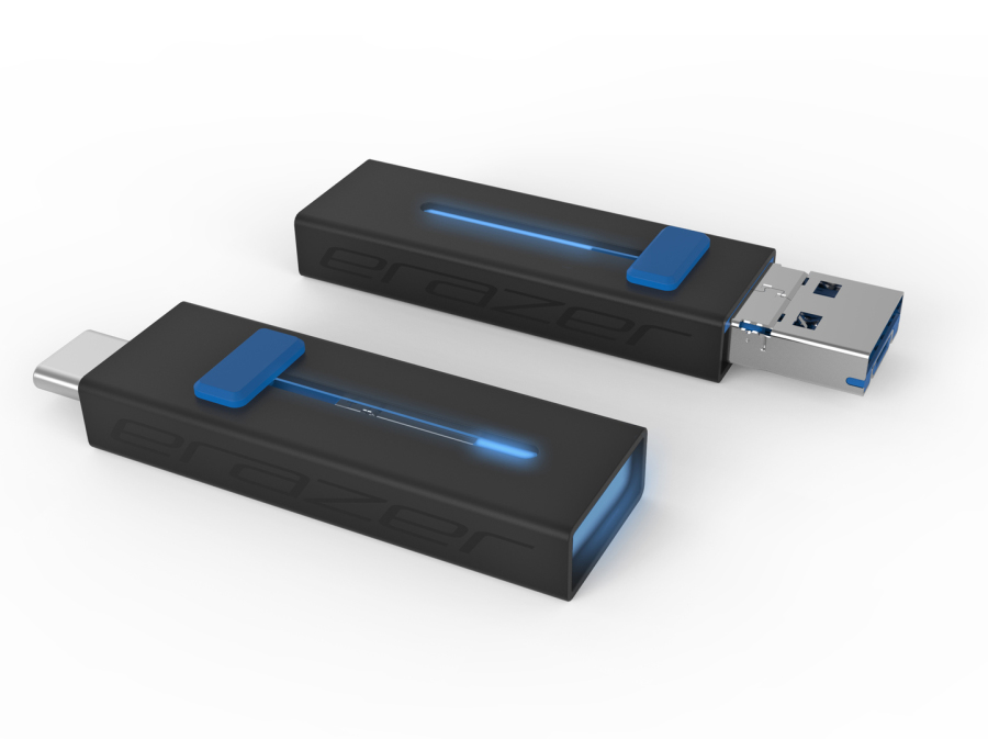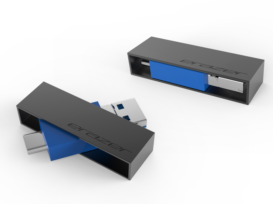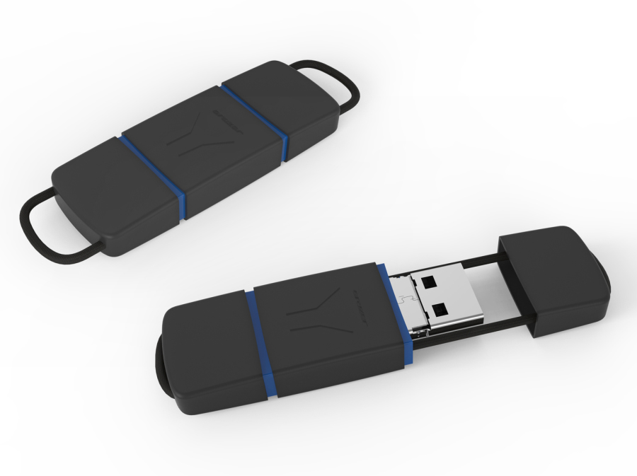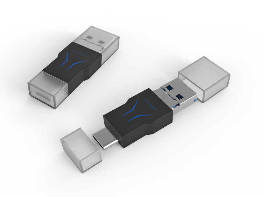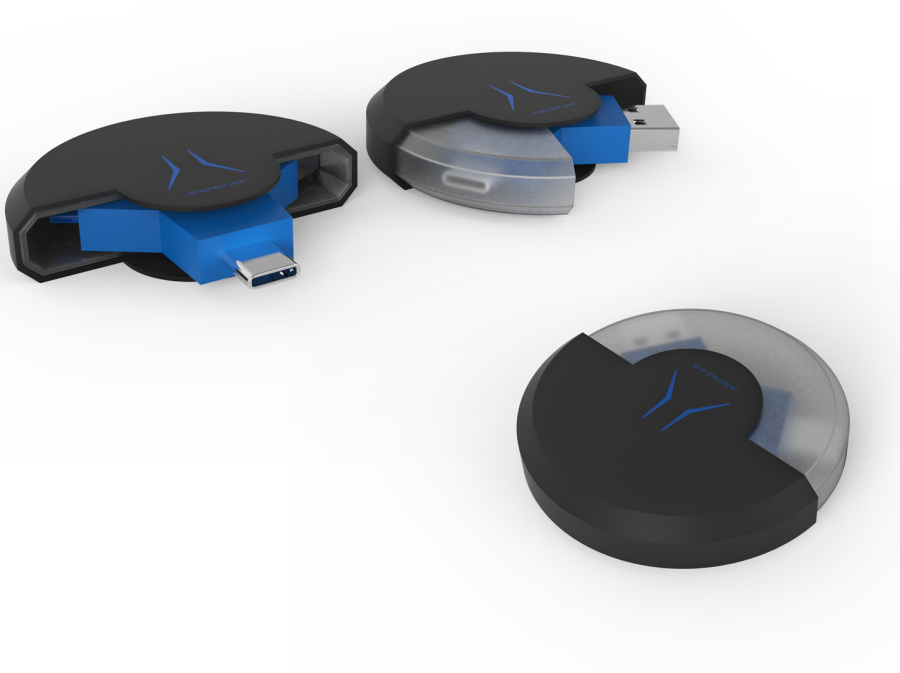 Die Aufgabe war es einen USB Stick mit drei verschiedenen Anschlüssen zu entwickeln. Zuerst untersuchte ich die möglichen Techniken und Kombinationen. Der Stick sollte so wenig Losteile wie möglich haben. Die Entwürfe entstanden im Auftrag für die Firma Medion. Das Erscheinungbild sollte in die Gamingsparte Erazer passen.