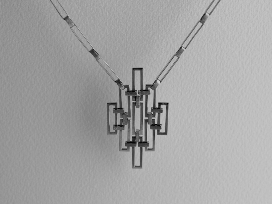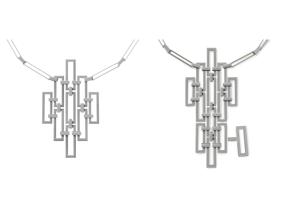 Die Marktanalyse des chinesischen Schmuckmarktes zeigte, dass bunter und filigraner Schmuck bevorzugt wird. Die Formen sind weniger gradlinig und mehr geschwungen. So wollte ich einen geometrischen Halsschmuck machen und dafür traditionelle Formen aus der chinesischen Kultur aufgreifen.